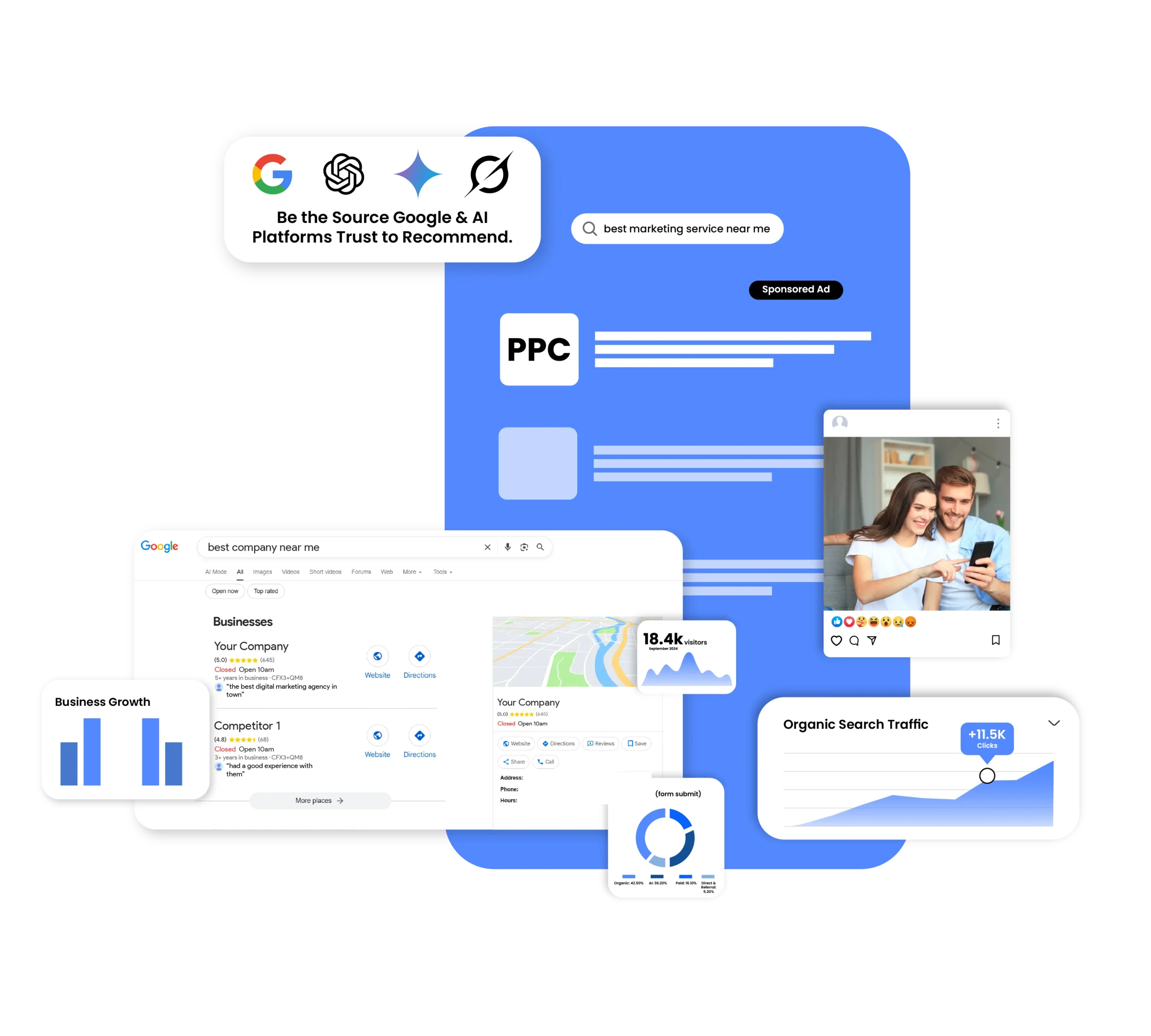 We connect local service providers with customers searching for solutions online. Our SEO, local ads, and CRO strategies drive bookings, calls, and long-term clients.
